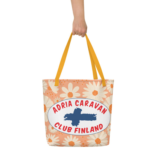 Trendikäs keltainen kantolaukku Adria Club Finlandin printillä
