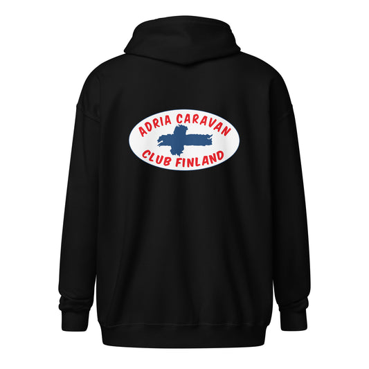 Vetoketjullinen huppari Adria Club Finlandin vaaleapohjaisella logolla edessä ja takana
