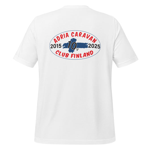 Unisex t-paita painetulla Adria Club Finlandin 10-v vaaleapohjaisella logolla