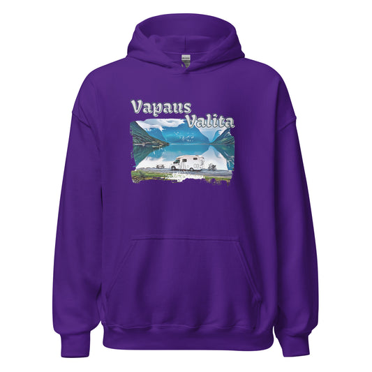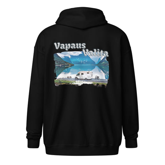 Karavaanarin vetoketjullinen huppari, jossa Vapaus valita -printti selässä