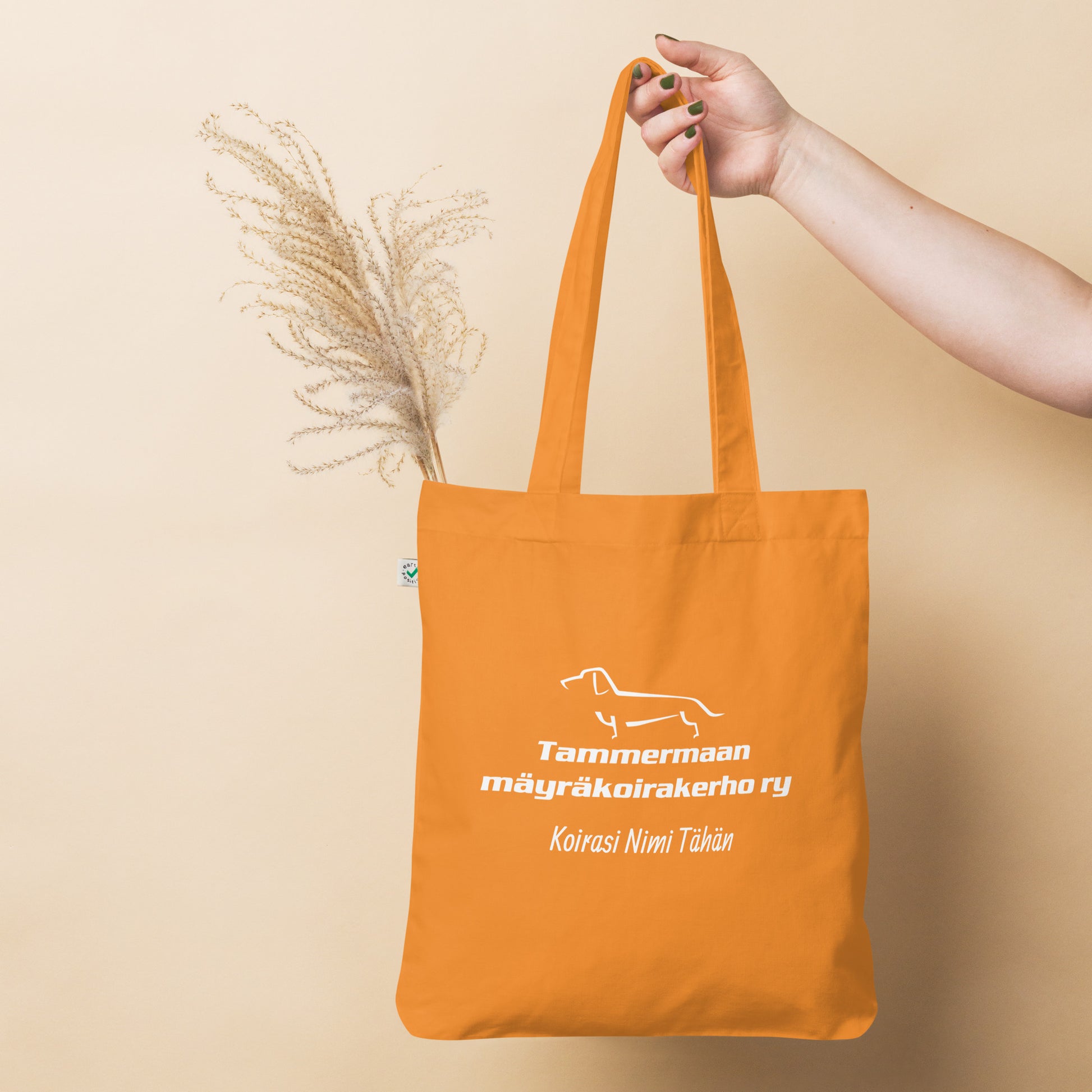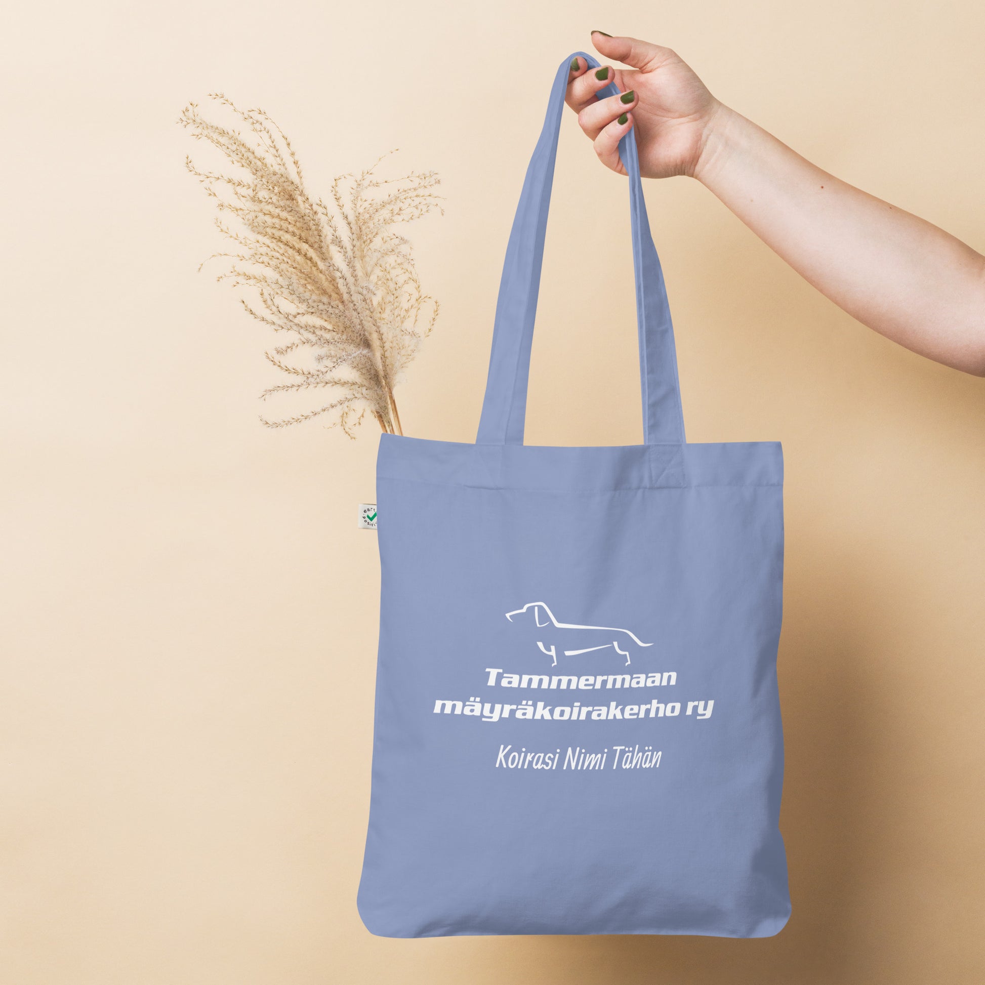 Kantolaukku luomu-puuvillaa Tammermaan logolla ja koirasi omalla nimellä