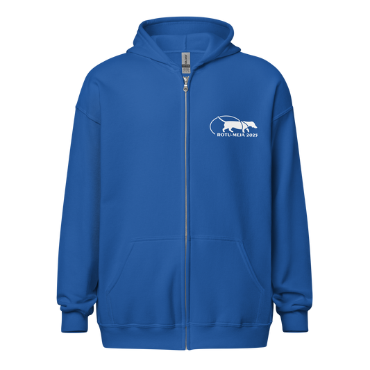 Unisex vetoketjullinen huppari painetulla Rotu-Mejä 2025 -logolla